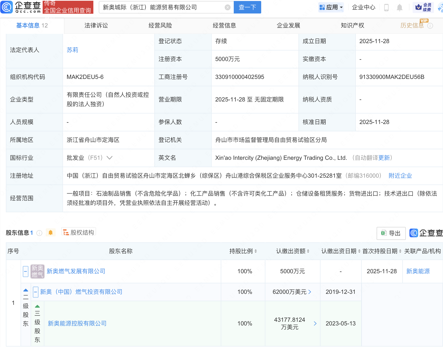 近日,新奥城际(浙江)能源贸易有限公司成立,注册资本5000万元,经营范围包含:仓储设备租赁服务;货物进出口;技术进出口等。企查查股权穿透显示,该公司由新奥能源(02688.HK)间接全资持股。